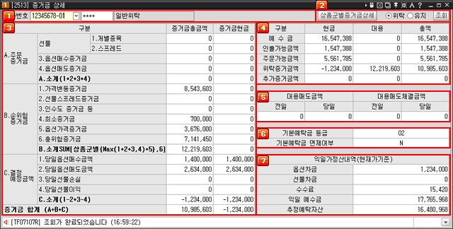 조회버튼을 클릭하면 해당계좌의 증거금현황, 예수금현황, 주문가능금액현황, 인출가능금액, 추가증거금,대용매매현황, 익일 가정산내역 을 조회처리 한다.