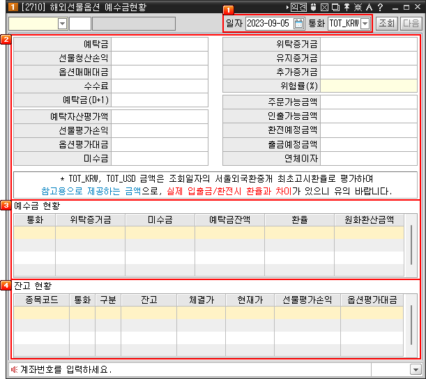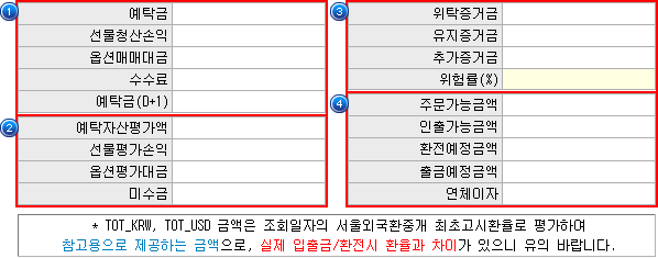 예수금 현황에 대한 통화별 분류로서, 해당계좌의 통화별 [위탁증거금] [미수금] [예탁금 잔액]은 물론 지정한 일자의 매매기준율로 환산한 TOT_KRW, TOT_USD [예수금 현황]을 한눈에 조회할 수 있습니다.