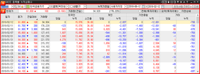 코스피/코스닥 종목에 대해서 투자주체별(외국인, 개인, 기관, 기타법인) 순매수, 누적순매수 자료가 일자별로 제공되는 화면입니다.