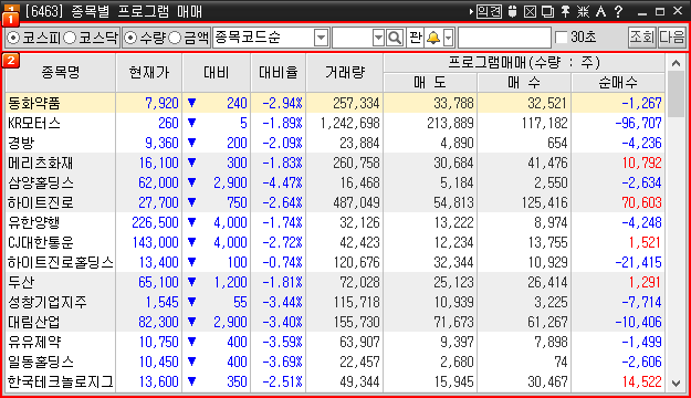 프로그램매매된 종목의 정렬기준을 선택할 수 있습니다.