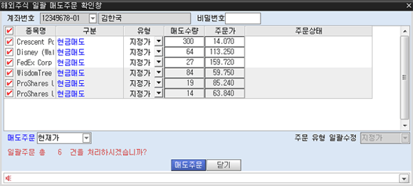 [일괄매도] 기능: 보유한 종목에서 원하는 종목을 복수 선정하여 한 화면에서 매도수량과 주문가 지정 가능.
