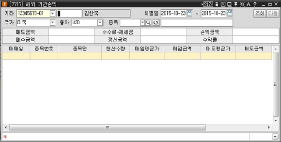 버튼 클릭 시 "[7717]기간손익" 화면이 팝업되어 기간별로 손익조회를 할 수 있습니다.
