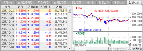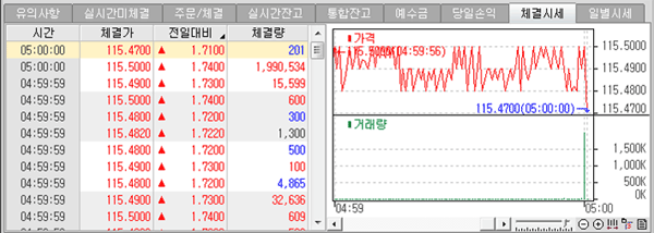 원하는 종목의 체결시세를 시간별로 확인할 수 있습니다.