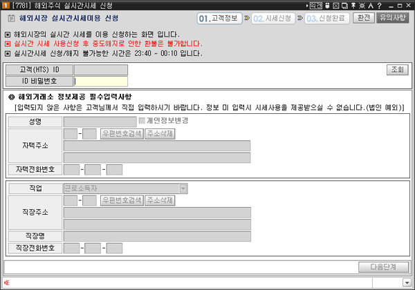 버튼 클릭 시 "[7781] 해외주식 실시간 시세 신청" 화면이 팝업 되어 실시간 시세를 신청할 수 있습니다.