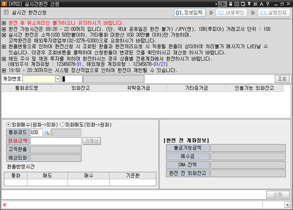 버튼 클릭 시 "[H702]해외실시간환전신청" 화면이 팝업 되어 환전신청을 할 수 있습니다.