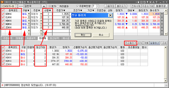 청산할 미결제 잔고를 선택(체크표시)한 후 “잔고올리기” 버튼을 클릭하면 청산가능수량이 있는 미결제잔고의 종목과 청산가능수량이 복수종목주문화면에 등록됩니다. 이때 청산주문을 수행하기 위하여 매매구분은 미결제잔고의 반대주문으로 설정됩니다. (매수 미결제인 경우 매도주문으로 설정)
