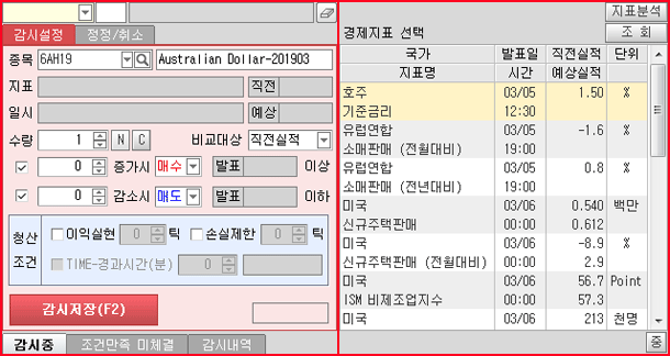 서버감시 경제지표주문은 사용자가 선택한 경지제표의 발표결과를 감시하며, 비교대상(직전실적 또는 예상실적)과 비교하여 자동으로 주문을 접수하는 기능입니다.