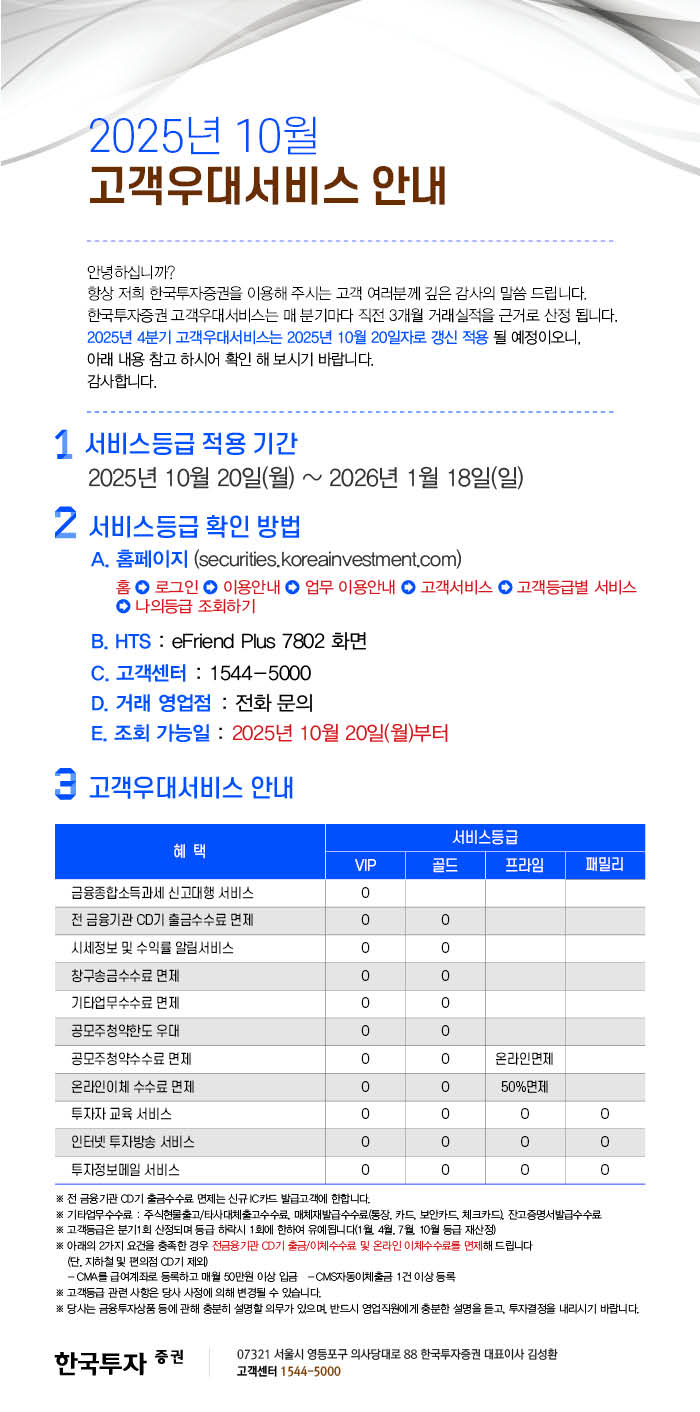 제목 [서비스] 2025년 10월 고객우대서비스등급 갱신 안내(10/20) 조회 53 등록일 2025.10.15 08:58