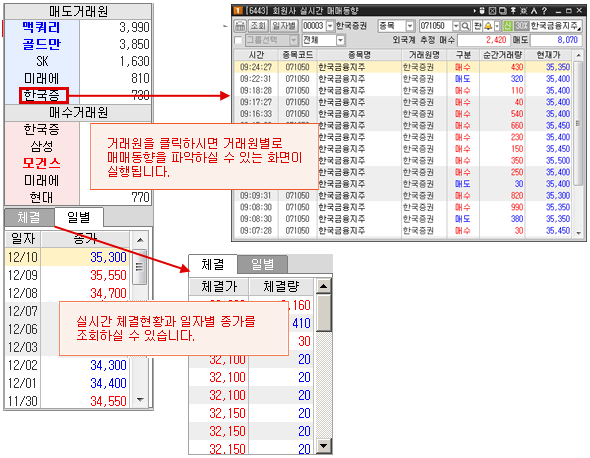 조회 종목의 주요 거래원 상위 5개사의 매수,매도 현황을 제공과 실시간 체결 및 일자별 종가를 조회할 수 있습니다.